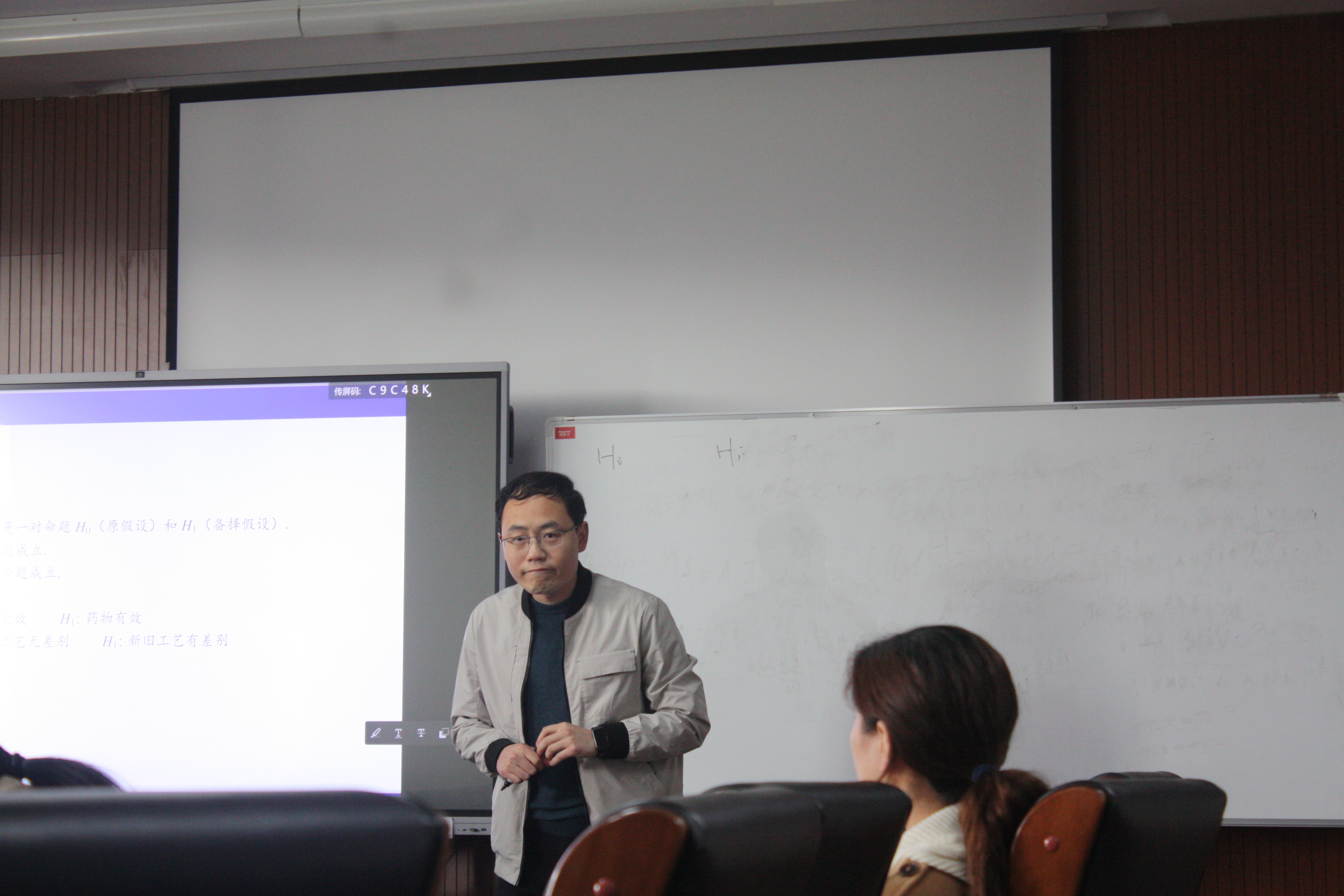 第二组中,老师都对上节课的内容进行回顾,这既能更好衔接接下来所授知识,更巩固了学生已学的知识,所谓“温故而知新”。在讲授概率论与数理统计的知识中,林炜老师选择对条件概率、贝叶斯公式的内容进行讲授,而李亚旭老师则是探讨了原假设与备则假设的问题。在老师们的内容讲授中,除了注重对概念得具体阐述,也对相关例题的解法进行了充分的说明,用具体的例子来加深学生对抽象概念的理解。