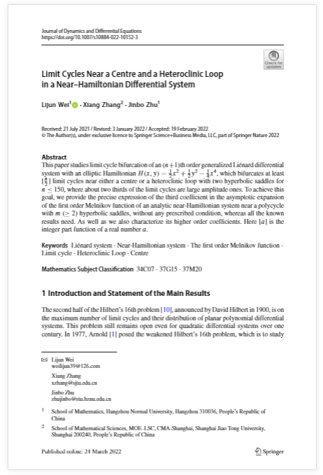 近日,色漫 数学与应用数学(师范)183班朱锦波同学在指导教师卫丽君老师的指导下,并与上海交通大学张祥教授合作在常微分方程与动力系统方向高水平国际期刊Journal of Dynamics and Differential Equations(JCR:Q1)上发表题为“Limit Cycles Near a Centre and a Heteroclinic Loop in a Near–Hamiltonian Differential System”的学术论文。
