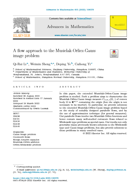 近日,学院青年教师易彩虹博士,与浙江大学盛为民教授、李奇睿教授、Memorial University of Newfoundland叶德平教授合作,在国际顶级数学期刊《Advances in Mathematics》发表题为《A flow approach to the Musielak-Orlicz-Gauss image problem》的学术论文。在该论文中,作者主要利用高斯曲率流方法结合逼近理论研究凸几何中的Musielak-Orlicz高斯图像问题非对称解的存在性,这是一类一般化问题。特别地,这一问题覆盖了众多著名的Monge-Ampre型Minkowski问题,因而该项研究可为这些Minkowski型问题解的存在性证明提供一般方法,是色漫 在几何方向研究的重要突破。