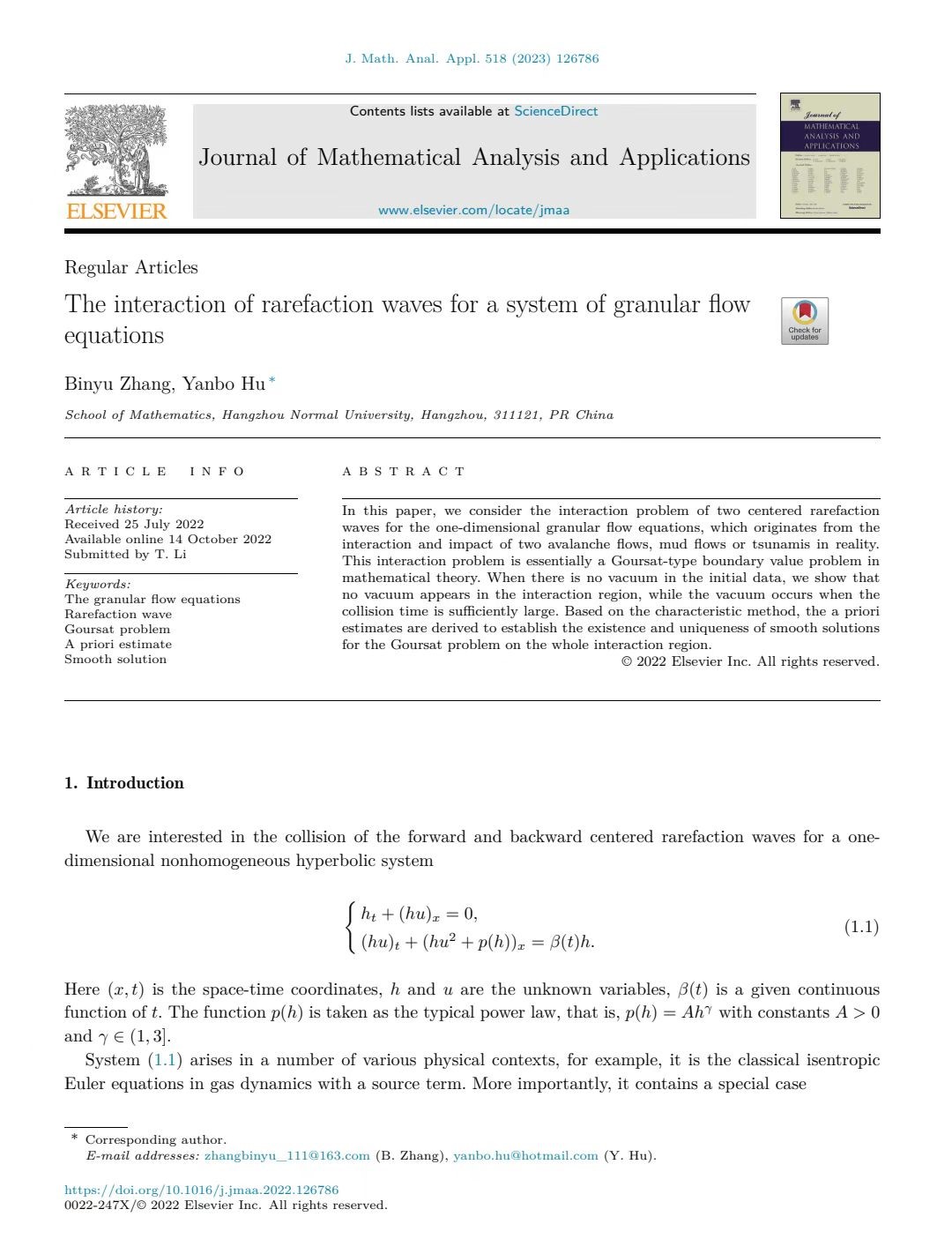 近日,色漫 数学与应用数学(师范)202班张缤予同学在胡燕波教授指导下以第一作者在国际知名期刊《Journal of Mathematical Analysis and Applications》(JCR:Q1)上发表题为 《The interaction of rarefaction waves for a system of granular flow equations》的学术论文。