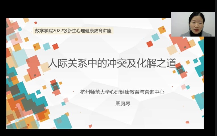 新生入学已有三个月时间,大多数学生已经较好地适应了大学的学习、生活节奏。在完成适应环节后,部分学生会陷入人际交往的困扰,不知道如何去解决。本次讲座以“人际关系中的冲突及化解之道”为主题,介绍了人际关系冲突的原因、冲突背后的情感需求,并提供了解决冲突的方法。