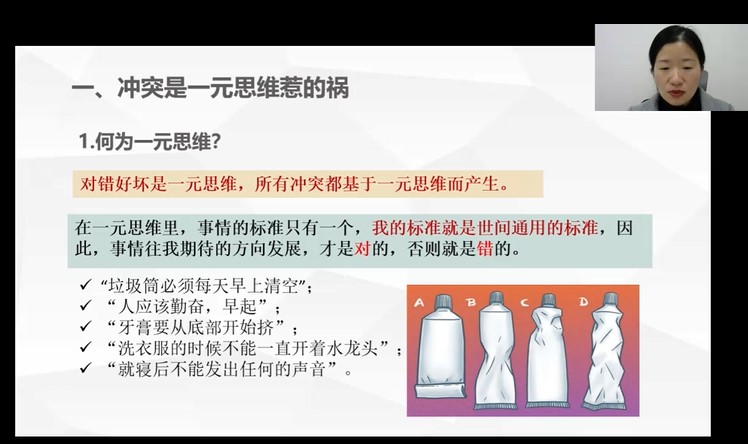 讲座开始,周老师展示了大学生在人际关系方面的困扰,引起学生的共鸣。随后,周老师点明冲突产生的原因是一元思维,并用几个生活中常见的事例帮助说明。学生需要从一元思维向二元思维、多元思维发展,学会用不同的视角、标准看待问题。