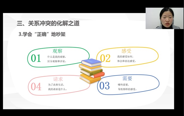 第三部分,周老师给出了三个化解关系冲突的方法,分别是:拥抱人格阴影、建立情感账户,培养亲密感、学会正确“吵架”,并通过生活中常见的一些冲突进行解释说明,用适当的方法会有显著的效果。