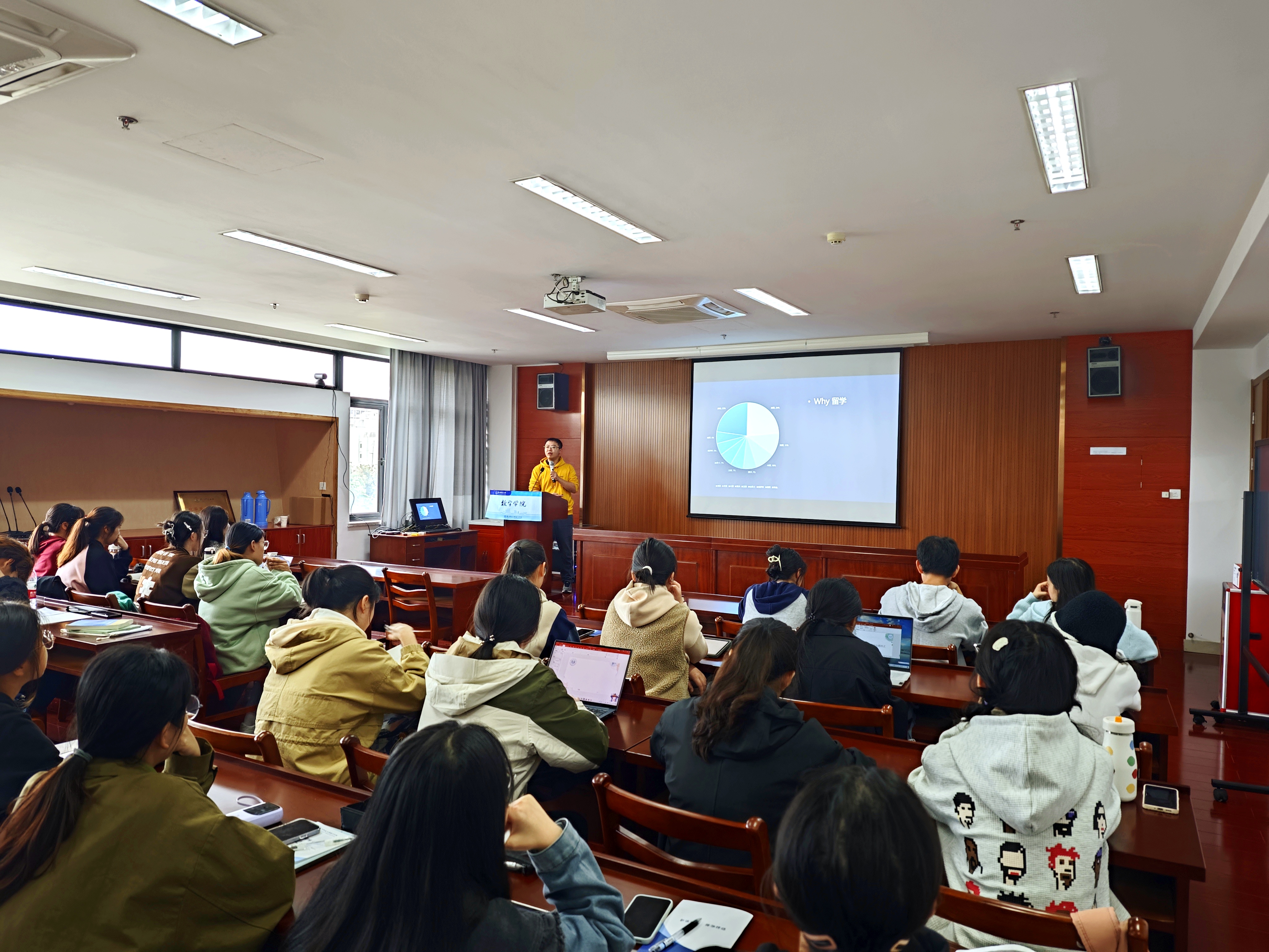 活动中,新通教育负责海外留学和雅思培训的专业老师分享了他们关于本科生留学和英语学习的一些心得。单老师从国内考研日益内卷、学历贬值的角度出发,向同学们阐述了留学的必要性、可能性和现实性,以及留学在学制、求职就业的独特优势,特别地,他结合数学专业的特点,就数学专业学生的可能留学专业进行了详细分析,为同学们日后留学提供了一种有益性参考。王老师从英语学习的角度出发,向同学们分享了关于英语学习的一些认识论和方法论层面的思考。她结合词汇记忆、听力练习、阅读理解、写作训练和口语对话等几个模块的重点、难点和痛点,以翔实的事例为依据,以科学的方法为指导,使现场的同学们获益匪浅。