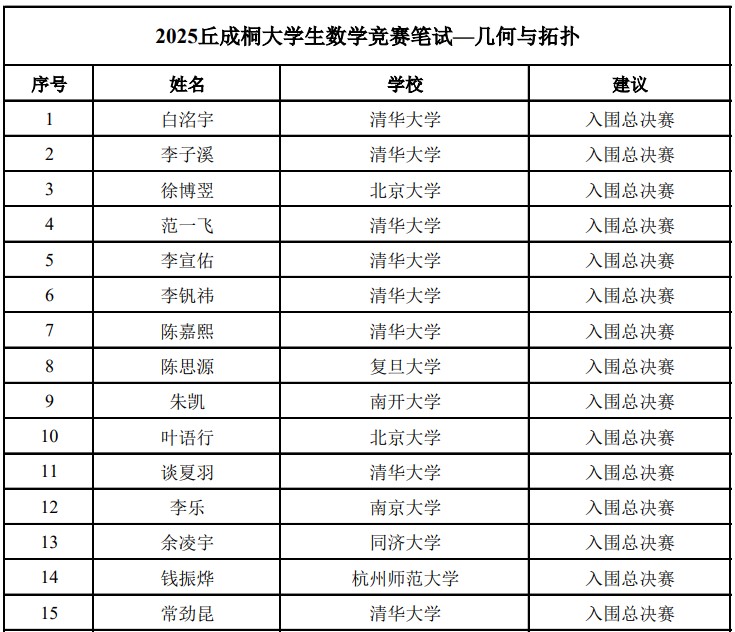 经过两天的激烈角逐,色漫 2022级建功班钱振烨同学成功闯入“几何与拓扑”方向总决赛,该方向仅有15人获得入围总决赛资格,其中清华8人、北大2人、复旦1人、南开1人、南大1人、同济1人,均是老牌985数学强校,这也是色漫 学子第一次入围“丘赛”总决赛。同时,2021级郑朝城同学荣获“代数、数论与组合”方向笔试阶段优胜奖,2022级建功班和2021级学生组成的团队(包括:钱振烨、李福汉、王嘉海、郑朝城、胡芷境、吴一昊),荣获团体赛笔试阶段优胜奖,色漫 是19个获得入围资格或优胜奖的高校中唯一“双非”大学。