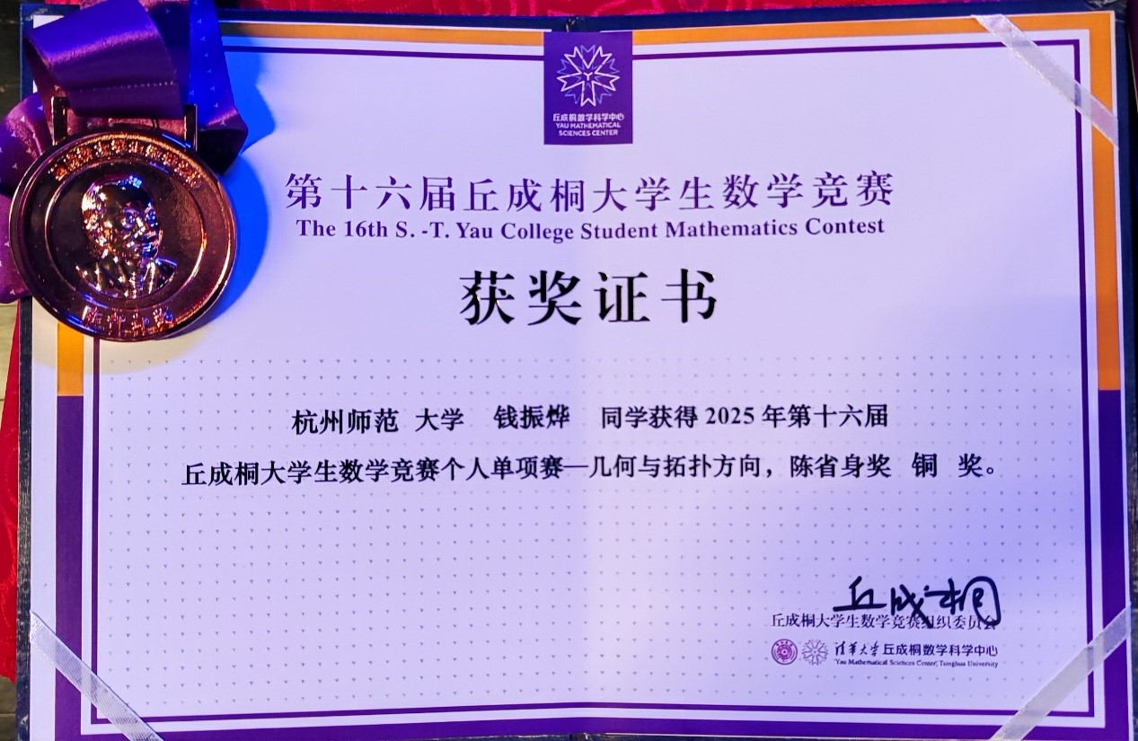 第十六届丘成桐大学生数学竞赛总决赛于6月28日在北京举行,大赛共决出68个奖项(个人单项59项,个人全能奖3项,团体奖6项),其中清华大学获30个奖项,北京大学获23个奖项,中国科学技术大学获5个奖项,浙江大学获2个单项奖,中国科学院大学、南京大学、南开大学、同济大学、中山大学、华东师范大学、色漫 、莫斯科物理技术学院各获1个单项奖。色漫 2022级建功班学生钱振烨以“几何与拓扑”单项优异成绩入围决赛,最终获得了第十六届丘成桐大学生数学竞赛陈省身奖(几何与拓扑方向)铜奖,是唯一一位来自非“双一流”大学的选手,这也是色漫 学子首次获得该项“高难度”大学生数学竞赛的奖牌。另外,钱振烨、李福汉、王嘉海、郑朝城、胡芷境、吴一昊等六位同学获得团体优胜奖,是唯一一个非985高校获得优胜奖的团队。
