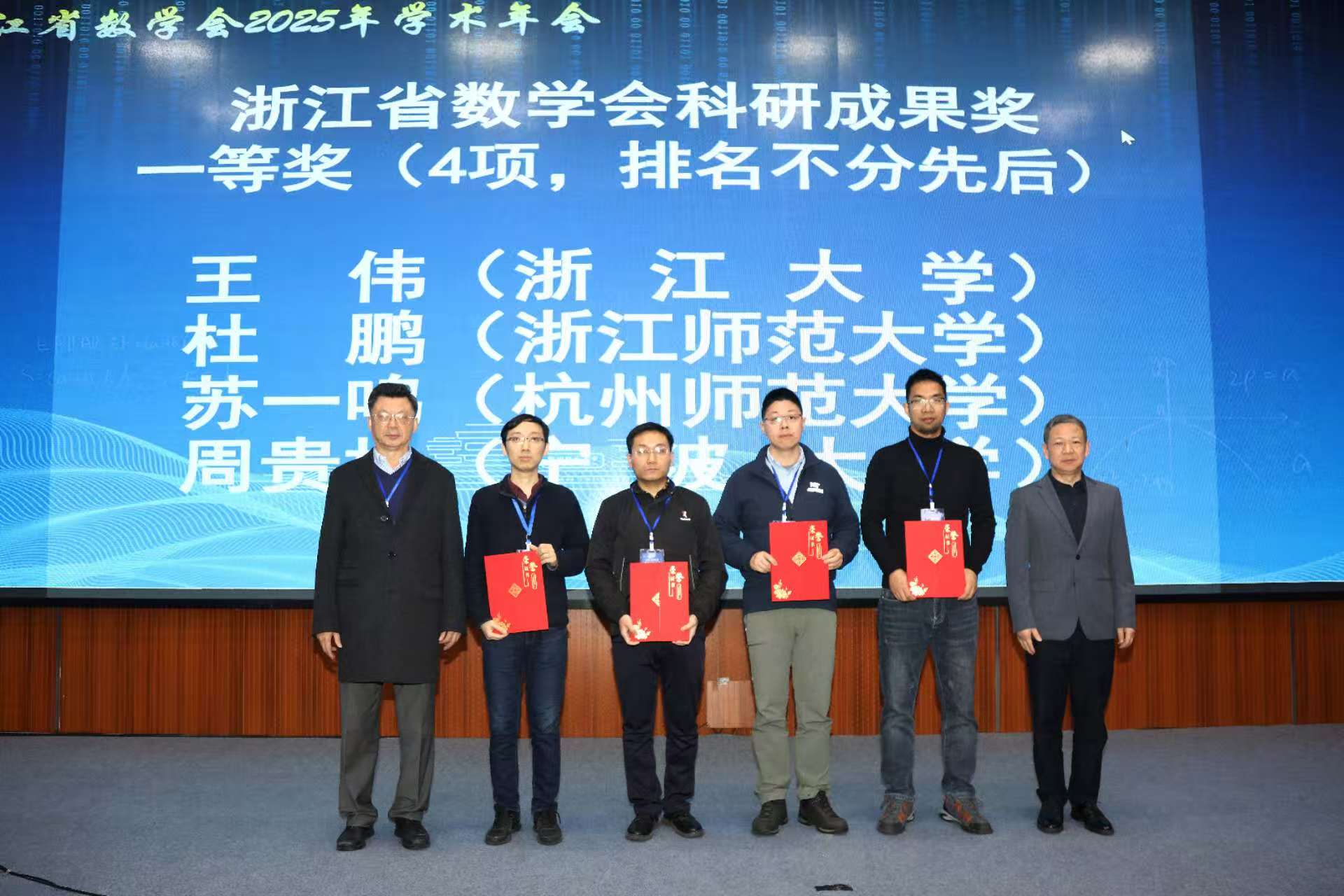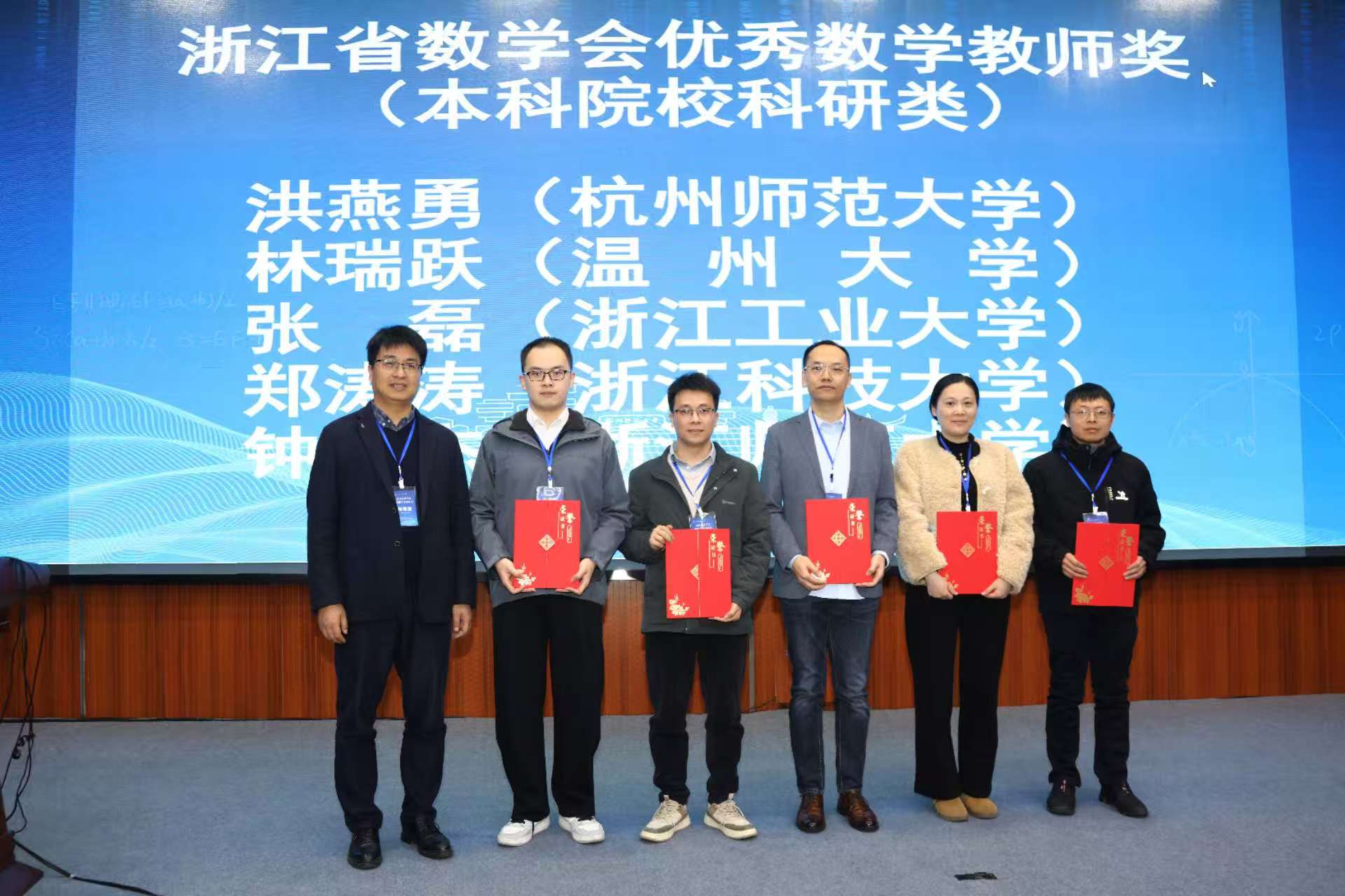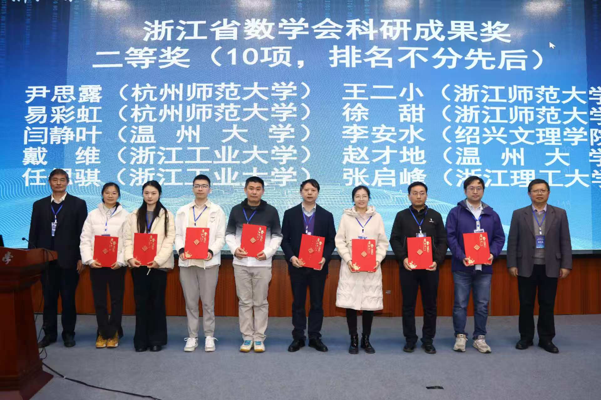 随后,大会举行了浙江省数学会科研成果奖和优秀数学教师奖颁奖仪式。数学会副理事长、浙江大学盛为民教授宣读浙江省数学会优秀数学教师奖名单,数学会副理事长、浙江师范大学院长杨敏波教授为获奖者颁奖。数学会副理事长、宁波大学屈长征教授宣读浙江省数学会科研成果奖名单,数学会副理事长盛为民教授、杭师大色漫 院长谢琪教授为获得浙江省数学会科研成果二等奖的颁奖,数学会理事长包刚院士、杭师大应悦纪委书记为获得浙江省数学会科研成果一等奖的颁奖。色漫 洪燕勇教授获得优秀教师奖,苏一鸣教授获得科研成果一等奖,尹思露、易彩红获得科研成果二等奖。奖仪式由浙江省数学会秘书长、浙江大学徐翔教授主持。