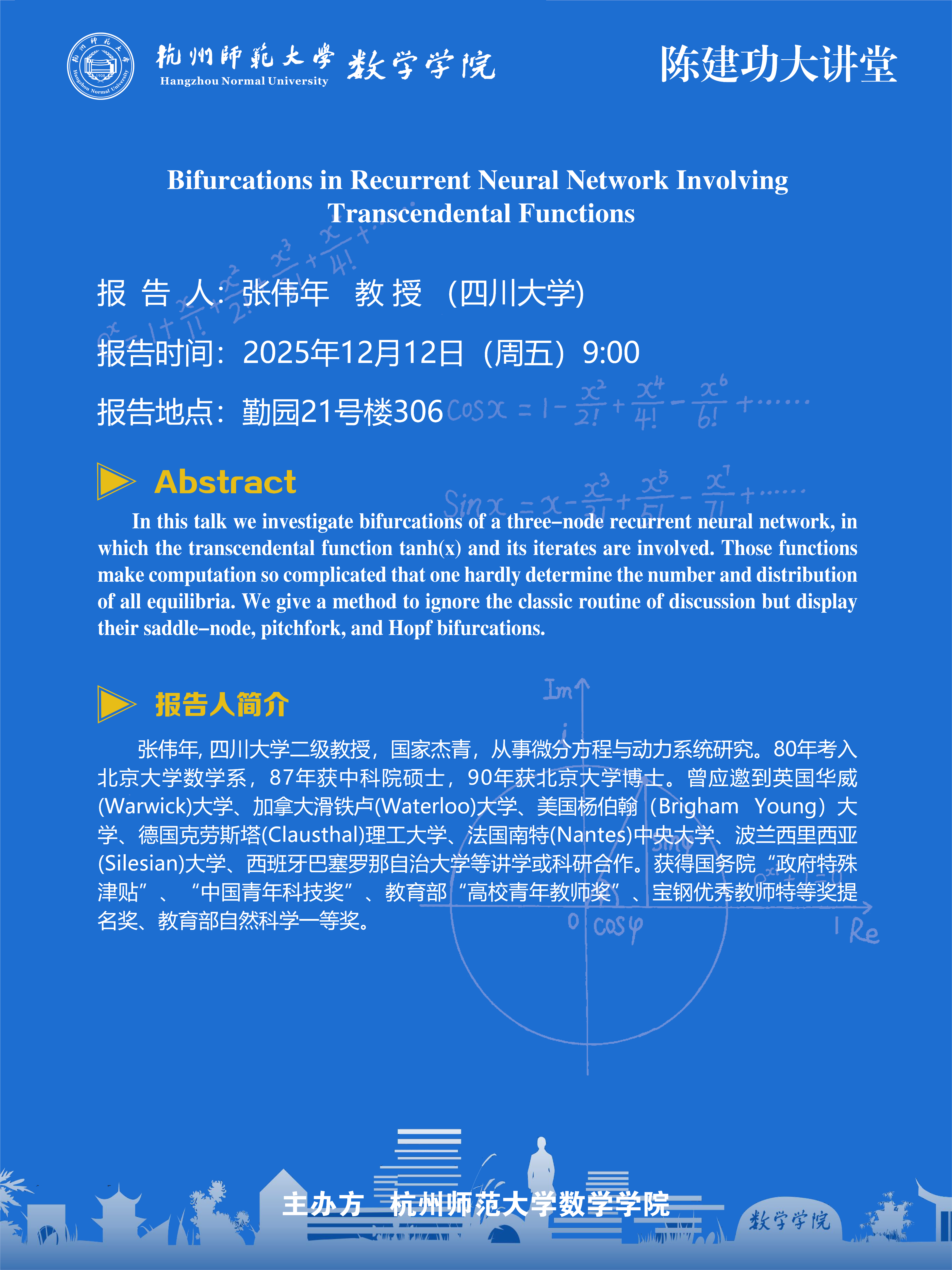 陈建功大讲堂(2025-159):Bifurcations in Recurrent Neural Network Involving Transcendental Functions
