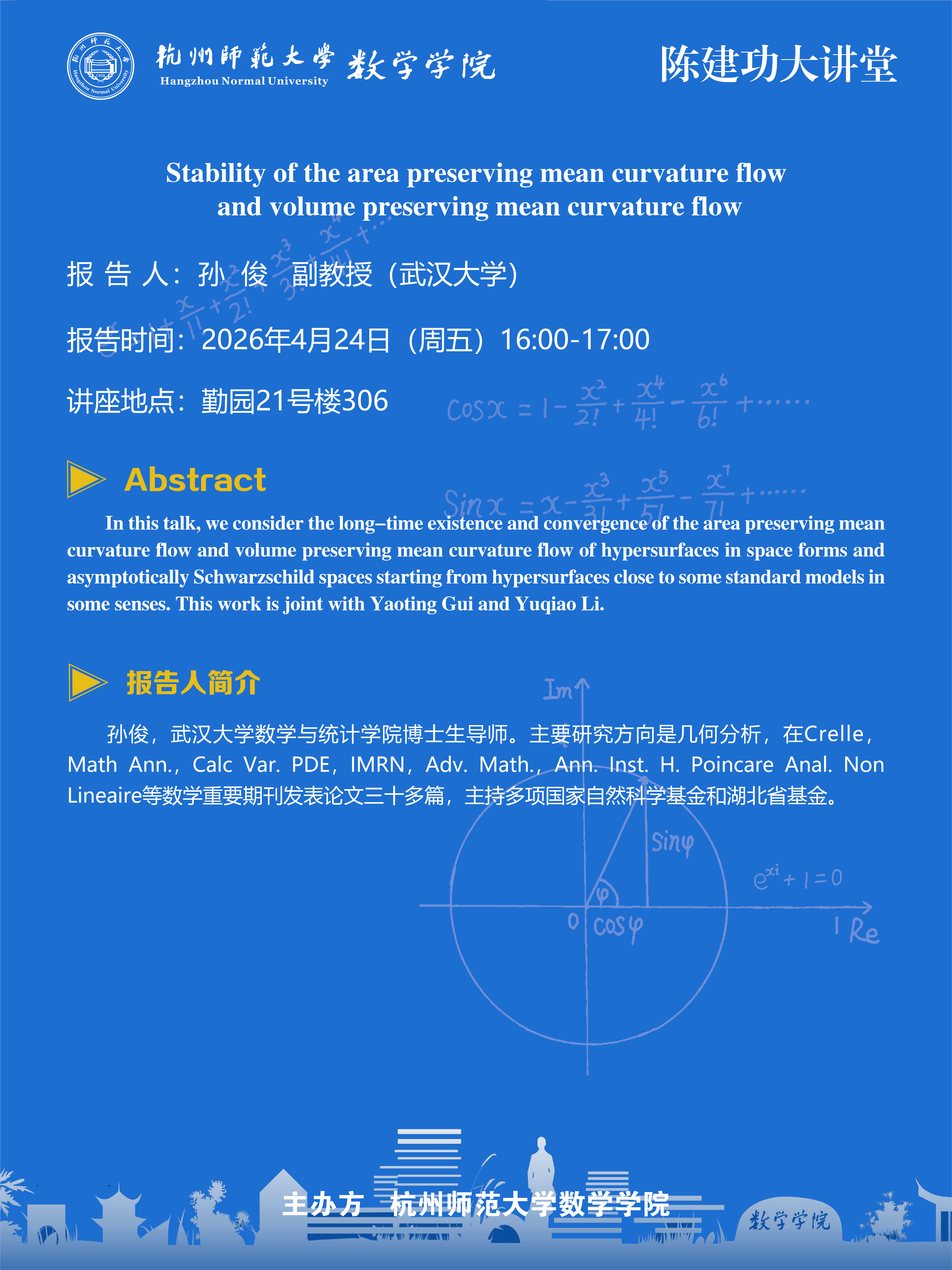 陈建功大讲堂(2026-15):Stability of the area preserving mean curvature flow and volume preserving mean curvature flow