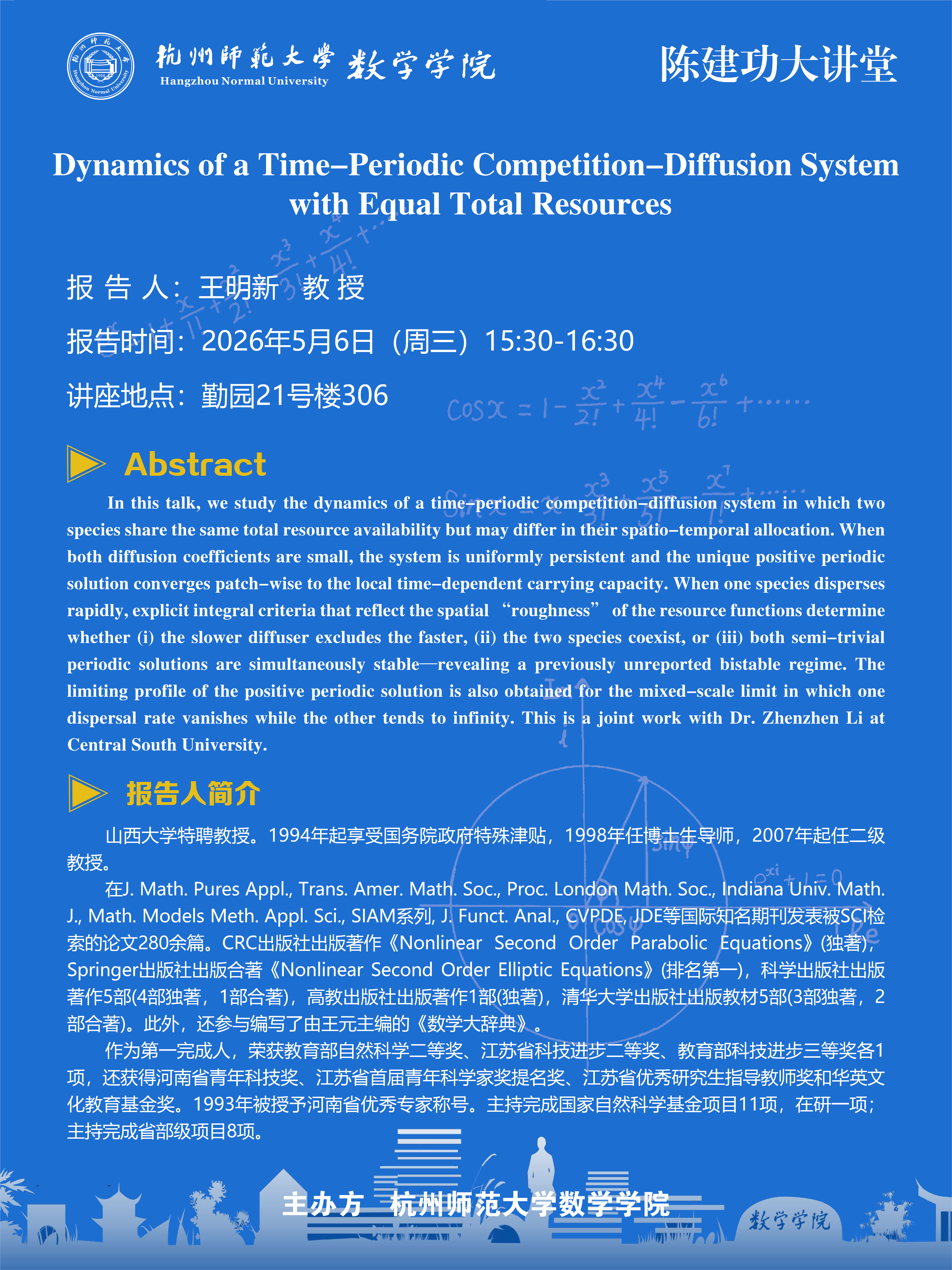 陈建功大讲堂(2026-22):Dynamics of a Time-Periodic Competition-Diffusion System with Equal Total Resources